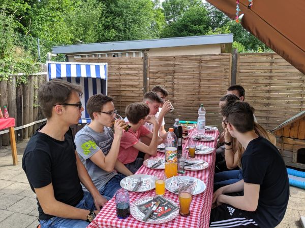 Bei dem schönen Wetter heute hatten wir uns überlegt, diese Firmstunde bei uns in den Garten zu verlegen. Für das leibliche Wohl unserer Gruppe haben wir mit frisch Gegrilltem selbst gesorgt - für das geistliche Wohl haben wir, wie zu Beginn jeder Stunde, um die Hilfe des Hl. Geistes gebeten.