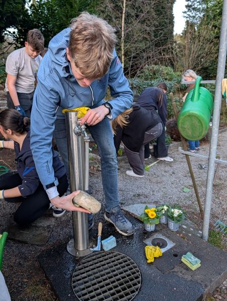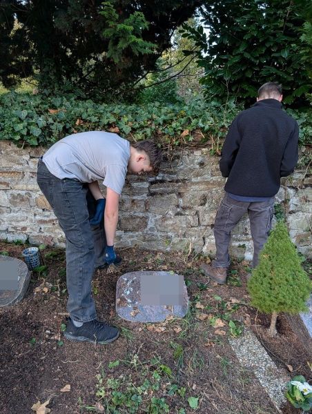 Während vorne eifrig gejätet wurde, bildete sich hinten auf dem Friedhof schnell eine kleine "Efeu-Crew", die sich um das Zurückschneiden der rankenden Pflanzen kümmerte. Andere widmeten sich mit erstaunlicher Geduld den Grabsteinen und reinigten sie gründlich.