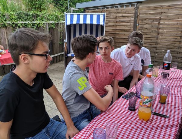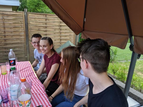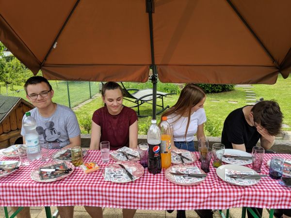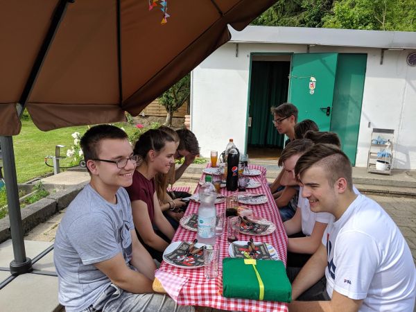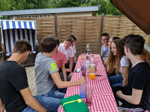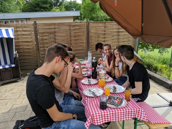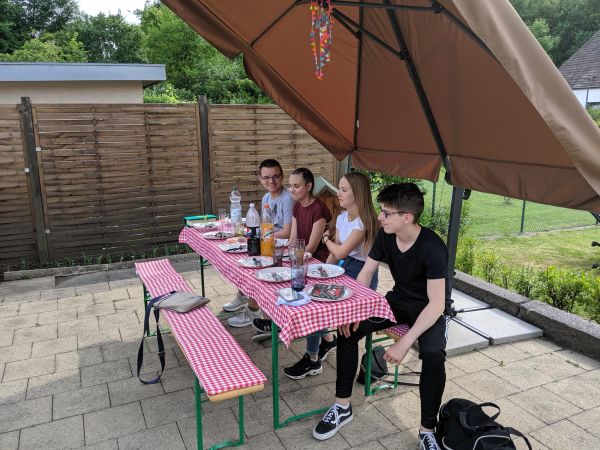 Bei dem schönen Wetter heute hatten wir uns überlegt, diese Firmstunde bei uns in den Garten zu verlegen. Für das leibliche Wohl unserer Gruppe haben wir mit frisch Gegrilltem selbst gesorgt - für das geistliche Wohl haben wir, wie zu Beginn jeder Stunde, um die Hilfe des Hl. Geistes gebeten.