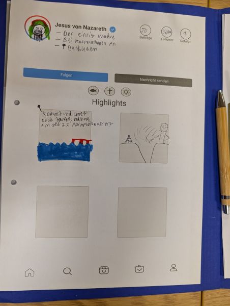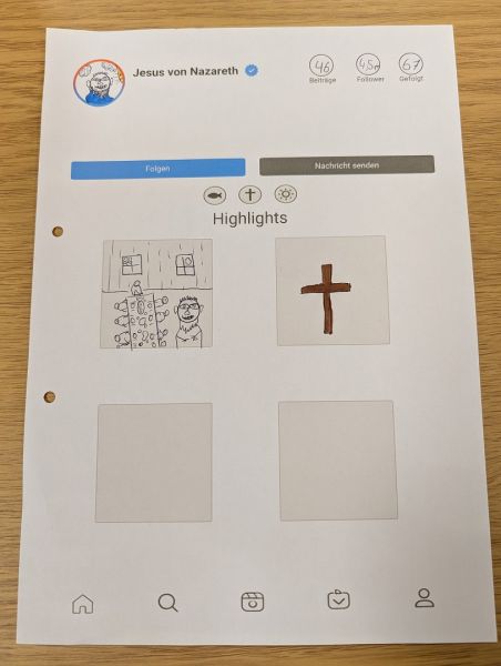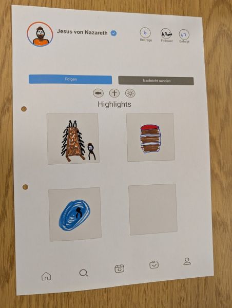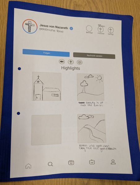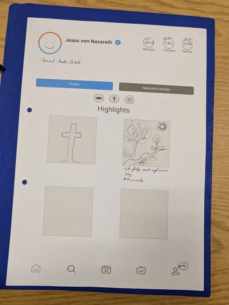 Nach dieser Reflexion holten wir Jesus direkt ins digitale Zeitalter. In einem kreativen Gedankenspiel entwarfen unsere Firmlinge ein modernes Social-Media-Profil für den Mann aus Nazareth. Die Entwürfe zeichneten das Bild eines "Influencers", der mit Millionen von Followern und dem blauen Haken dennoch bodenständig bleibt. In der Bio hieß es etwa "für alle da" oder "bei Kooperationen in Bethlehem melden", während die geposteten Story-Highlights zur Taufe einluden - inklusive des praktischen Hinweises auf verfügbare Parkplätze am See. Unter dem Hashtag "#binimmerda" wurde deutlich: Für die Jugendlichen ist Jesus eine Persönlichkeit, die heute genauso relevant und erreichbar ist wie damals.