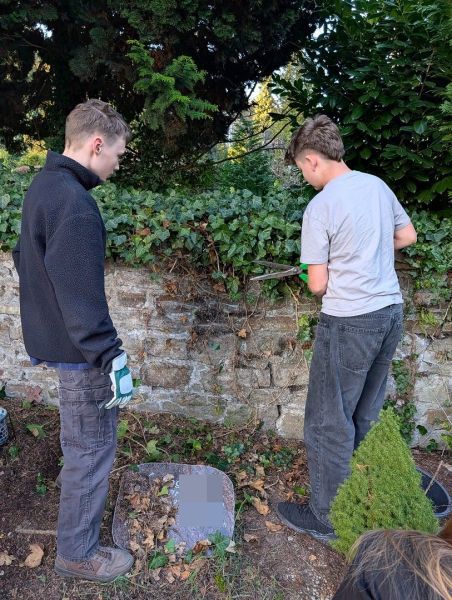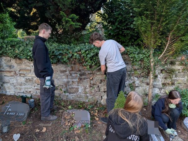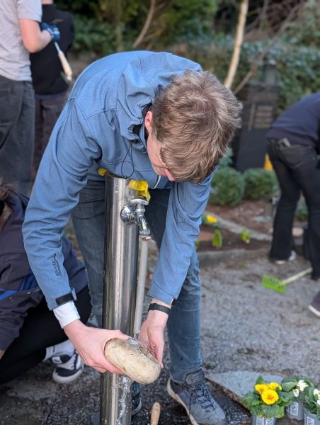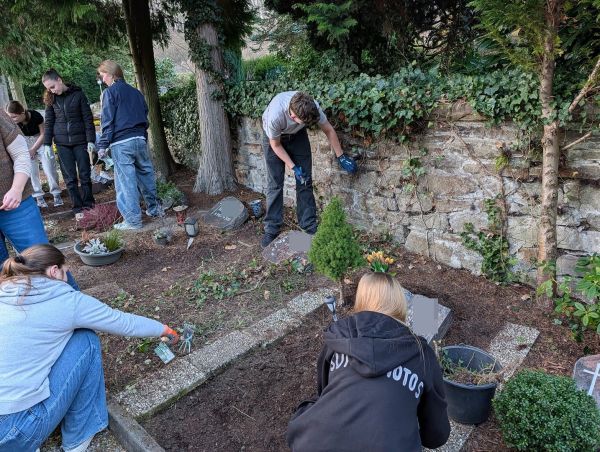 Während vorne eifrig gejätet wurde, bildete sich hinten auf dem Friedhof schnell eine kleine "Efeu-Crew", die sich um das Zurückschneiden der rankenden Pflanzen kümmerte. Andere widmeten sich mit erstaunlicher Geduld den Grabsteinen und reinigten sie gründlich.